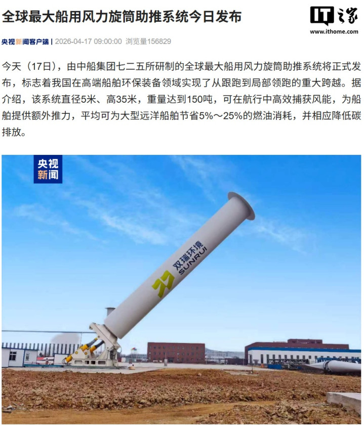 IT之家4月17日消息,据央视新闻报道,由中船集团七二五所研制的全球最大船用风力旋筒助推系统今日将正式发布,标志着我国在高端船舶环保装备领域实现了从跟跑到局部领跑的重大跨越。